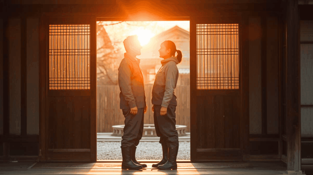 窓の外、雨音はいつの間にか止んでいた。 雲の切れ間から差し込むのは、月光よりも鋭く、太陽よりも慈悲深い、夜明け前の予感に満ちた蒼い光だ。 リビングの中央で、昭夫と節子は立ち尽くしていた。 漆黒の素材に包まれた二人の身体は、数時間前まで... -
