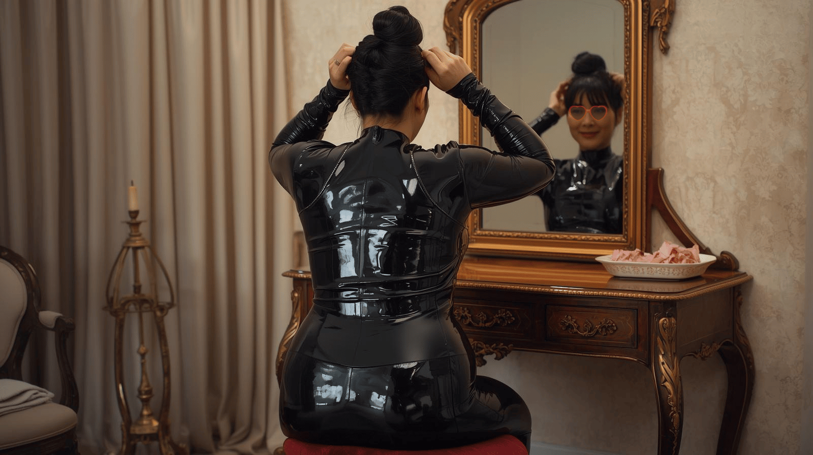 ラテックスの中は、私だけの密やかなサウナ。呼吸をするたび、指先を動かすたび、体中から溢れ出す汗が、シリコンオイルと混ざり合い、温かな液体の膜となって全身を包み込みます。